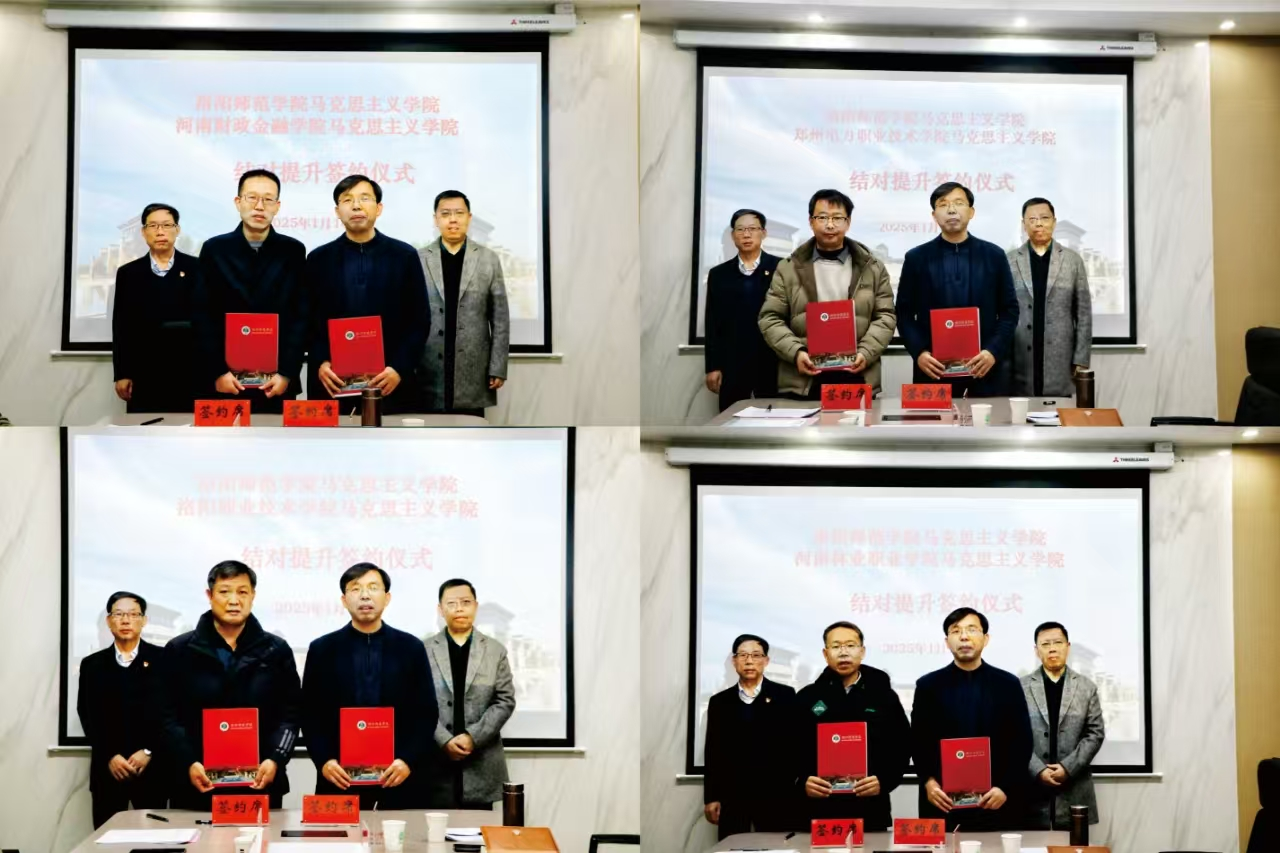 为深入学习贯彻中共中央办公厅《关于加强新时代马克思主义学院建设的意见》等文件精神,落实中共河南省委教育工委、河南省教育厅印发的《河南省高校马克思主义学院结对提升工作方案的通知》(豫教工委〔2024〕175号)要求,1月16日,我院与洛阳师范学院、河南林业职业学院、洛阳职业技术学院、郑州电力职业技术学院等四所高校的马克思主义学院于洛阳师范学院A3 - 407会议室举行了结对提升现场签约仪式。